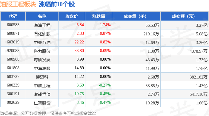 证券之星消息,11月10日油服工程板块较上一交易日上涨0.28%,海油工程领涨。当日上证指数报收于4018.6,上涨0.53%。深证成指报收于13427.61,上涨0.18%。油服工程板块个股涨跌见下表: