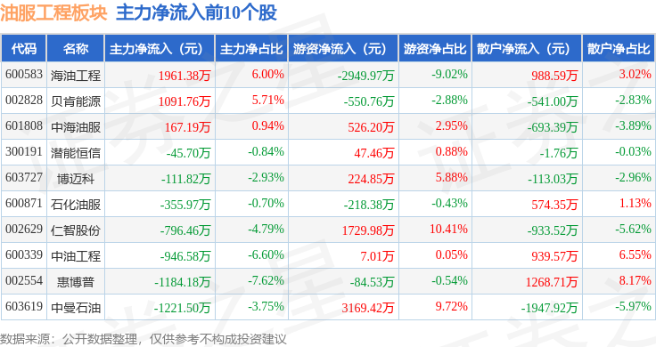 从资金流向上来看,当日油服工程板块主力资金净流出9853.75万元,游资资金净流入2696.71万元,散户资金净流入7157.03万元。油服工程板块个股资金流向见下表: