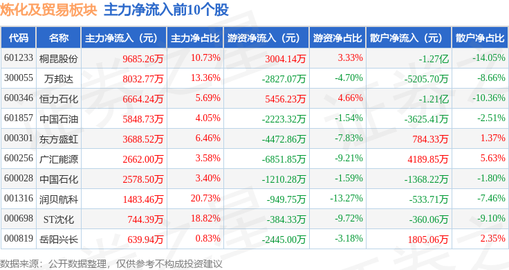 从资金流向上来看,当日炼化及贸易板块主力资金净流入5078.81万元,游资资金净流出5058.07万元,散户资金净流出20.74万元。炼化及贸易板块个股资金流向见下表: