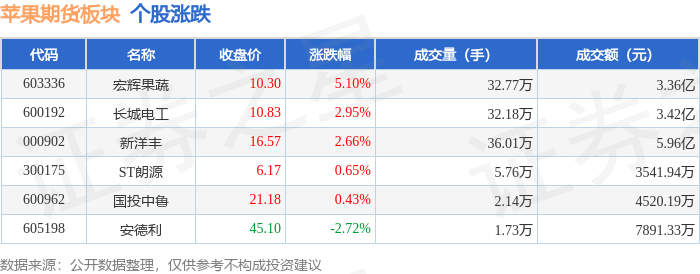 证券之星消息,11月10日苹果期货板块较上一交易日上涨1.27%,宏辉果蔬领涨。当日上证指数报收于4018.6,上涨0.53%。深证成指报收于13427.61,上涨0.18%。苹果期货板块个股涨跌见下表:
