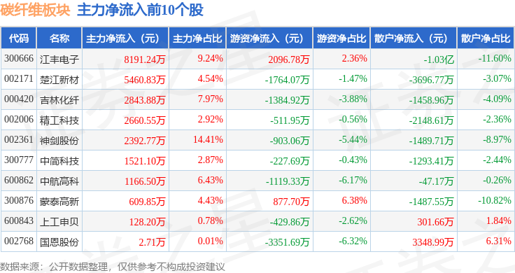 从资金流向上来看,当日碳纤维板块主力资金净流出5.91亿元,游资资金净流入4694.35万元,散户资金净流入5.44亿元。碳纤维板块个股资金流向见下表: