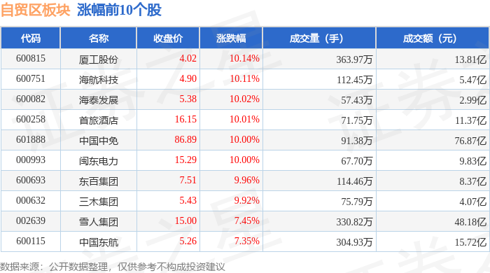 从资金流向上来看,当日自贸区板块主力资金净流入13.71亿元,游资资金净流出14.39亿元,散户资金净流入6826.64万元。自贸区板块个股资金流向见下表: