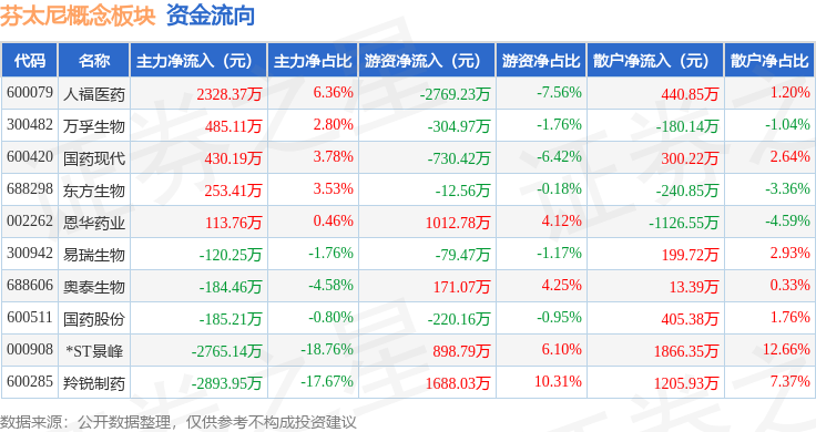 从资金流向上来看,当日芬太尼概念板块主力资金净流出2538.16万元,游资资金净流出346.13万元,散户资金净流入2884.3万元。芬太尼概念板块个股资金流向见下表: