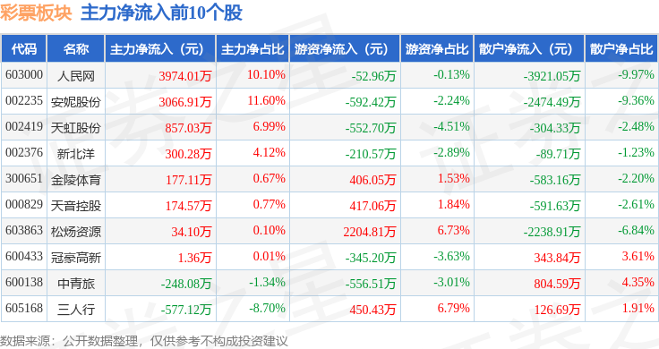 从资金流向上来看,当日彩票板块主力资金净流出3704.03万元,游资资金净流入1181.09万元,散户资金净流入2522.95万元。彩票板块个股资金流向见下表: