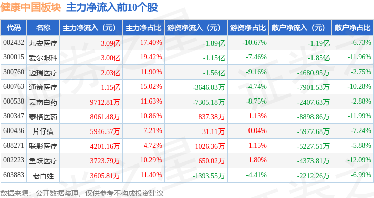 从资金流向上来看,当日健康中国板块主力资金净流入5.01亿元,游资资金净流出3.31亿元,散户资金净流出1.7亿元。健康中国板块个股资金流向见下表: