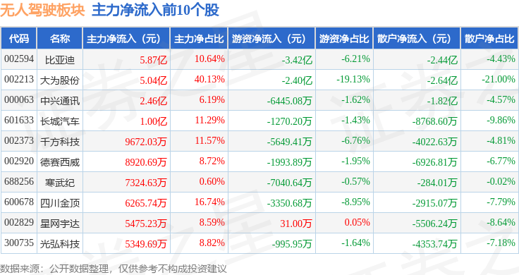 从资金流向上来看,当日无人驾驶板块主力资金净流出54.98亿元,游资资金净流入12.15亿元,散户资金净流入42.84亿元。无人驾驶板块个股资金流向见下表: