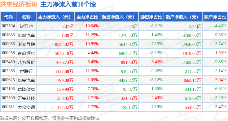 从资金流向上来看,当日共享经济板块主力资金净流出4.87亿元,游资资金净流出2.07亿元,散户资金净流入6.94亿元。共享经济板块个股资金流向见下表: