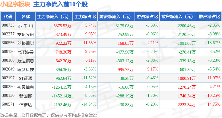 从资金流向上来看,当日小程序板块主力资金净流出2.27亿元,游资资金净流入849.77万元,散户资金净流入2.18亿元。小程序板块个股资金流向见下表: