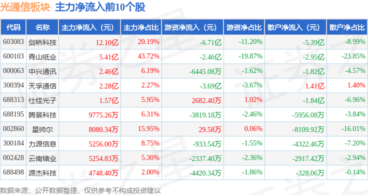 从资金流向上来看,当日光通信板块主力资金净流出42.81亿元,游资资金净流入8.67亿元,散户资金净流入34.14亿元。光通信板块个股资金流向见下表: