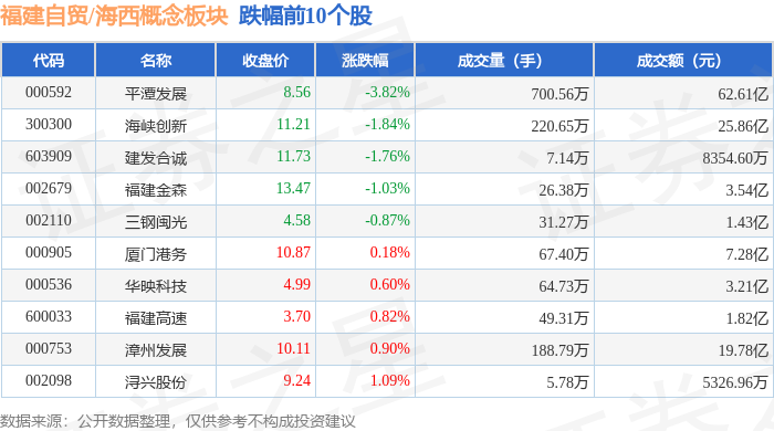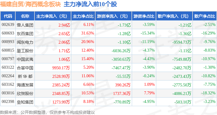 从资金流向上来看,当日福建自贸/海西概念板块主力资金净流入5.84亿元,游资资金净流出4.17亿元,散户资金净流出1.67亿元。福建自贸/海西概念板块个股资金流向见下表: