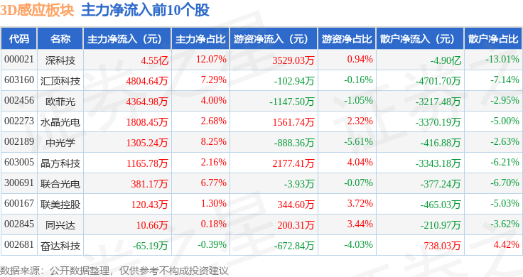 从资金流向上来看,当日3D感应板块主力资金净流出8.19亿元,游资资金净流入3.94亿元,散户资金净流入4.25亿元。3D感应板块个股资金流向见下表: