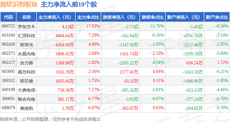 从资金流向上来看,当日指纹识别板块主力资金净流出1.35亿元,游资资金净流出1.44亿元,散户资金净流入2.79亿元。指纹识别板块个股资金流向见下表: