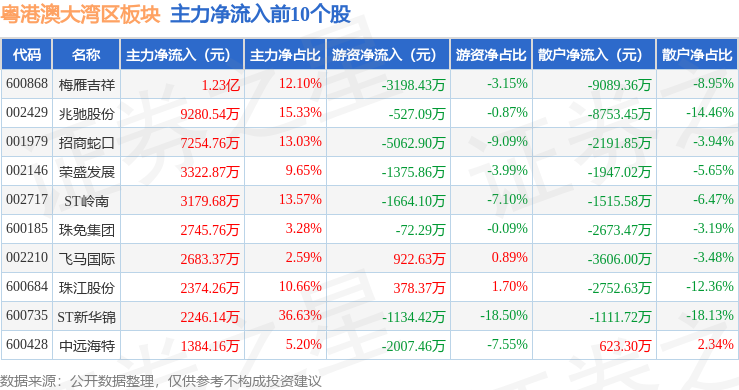 从资金流向上来看,当日粤港澳大湾区板块主力资金净流出2.92亿元,游资资金净流出6767.19万元,散户资金净流入3.6亿元。粤港澳大湾区板块个股资金流向见下表: