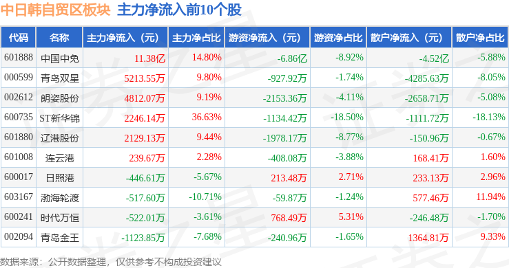 从资金流向上来看,当日中日韩自贸区板块主力资金净流入12.4亿元,游资资金净流出7.27亿元,散户资金净流出5.14亿元。中日韩自贸区板块个股资金流向见下表: