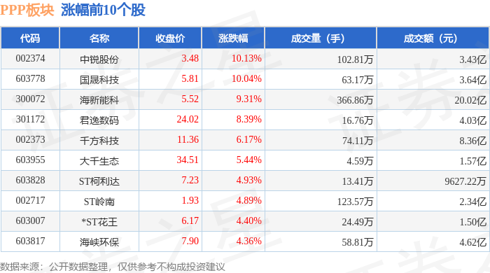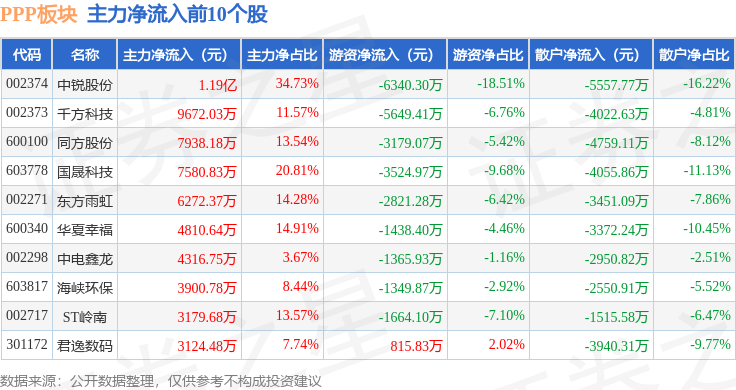 从资金流向上来看,当日PPP板块主力资金净流出9.99亿元,游资资金净流出1.27亿元,散户资金净流入11.25亿元。PPP板块个股资金流向见下表: