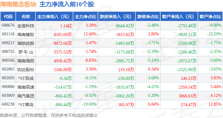 从资金流向上来看,当日海南概念板块主力资金净流出12.71亿元,游资资金净流出5967.18万元,散户资金净流入13.31亿元。海南概念板块个股资金流向见下表: