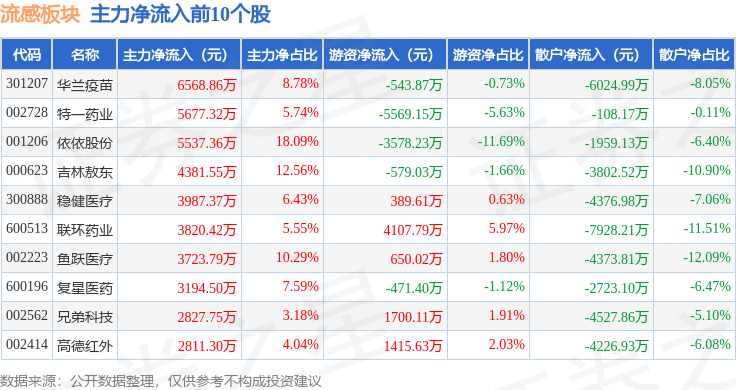 从资金流向上来看,当日流感板块主力资金净流出2.95亿元,游资资金净流出1.74亿元,散户资金净流入4.68亿元。流感板块个股资金流向见下表: