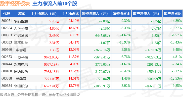 从资金流向上来看,当日数字经济板块主力资金净流出48.91亿元,游资资金净流入7.49亿元,散户资金净流入41.42亿元。数字经济板块个股资金流向见下表: