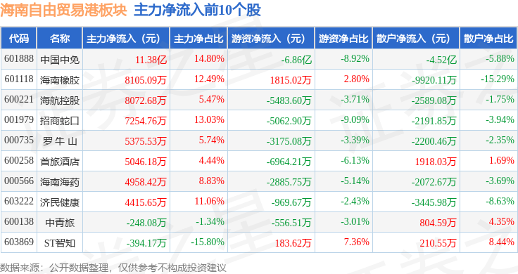 从资金流向上来看,当日海南自由贸易港板块主力资金净流入10.42亿元,游资资金净流出9.78亿元,散户资金净流出6344.94万元。海南自由贸易港板块个股资金流向见下表: