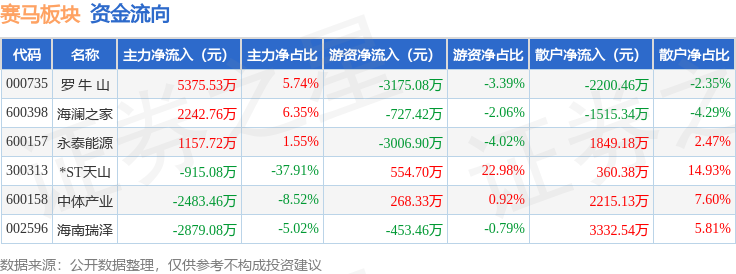 从资金流向上来看,当日赛马板块主力资金净流入2498.39万元,游资资金净流出6539.82万元,散户资金净流入4041.43万元。赛马板块个股资金流向见下表: