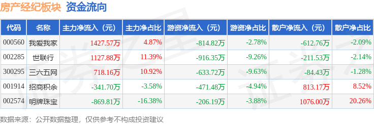 从资金流向上来看,当日房产经纪板块主力资金净流入2062.1万元,游资资金净流出3042.55万元,散户资金净流入980.45万元。房产经纪板块个股资金流向见下表: