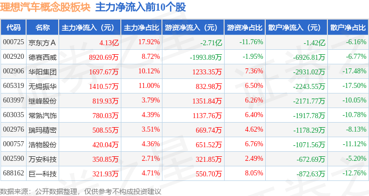 从资金流向上来看,当日理想汽车概念股板块主力资金净流出2.87亿元,游资资金净流入1.29亿元,散户资金净流入1.57亿元。理想汽车概念股板块个股资金流向见下表:
