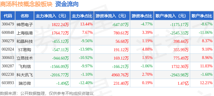 从资金流向上来看,当日商汤科技概念股板块主力资金净流出1.68亿元,游资资金净流入5576.41万元,散户资金净流入1.13亿元。商汤科技概念股板块个股资金流向见下表: