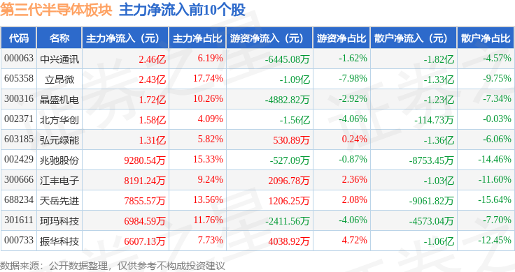 从资金流向上来看,当日第三代半导体板块主力资金净流出33.7亿元,游资资金净流入9.54亿元,散户资金净流入24.16亿元。第三代半导体板块个股资金流向见下表: