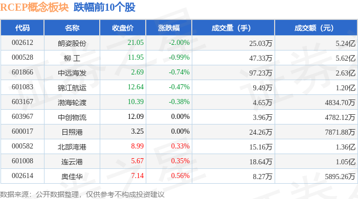 从资金流向上来看,当日RCEP概念板块主力资金净流入1707.57万元,游资资金净流出2298.27万元,散户资金净流入590.7万元。RCEP概念板块个股资金流向见下表: