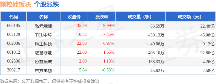 证券之星消息,11月10日颗粒硅板块较上一交易日上涨3.38%,弘元绿能领涨。当日上证指数报收于4018.6,上涨0.53%。深证成指报收于13427.61,上涨0.18%。颗粒硅板块个股涨跌见下表: