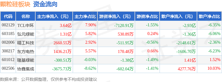 从资金流向上来看,当日颗粒硅板块主力资金净流入4.96亿元,游资资金净流出2.13亿元,散户资金净流出2.83亿元。颗粒硅板块个股资金流向见下表: