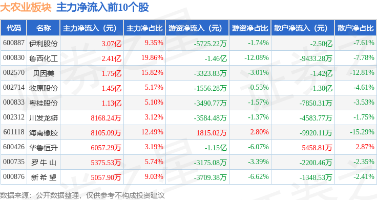 从资金流向上来看,当日大农业板块主力资金净流出2.67亿元,游资资金净流出6.68亿元,散户资金净流入9.35亿元。大农业板块个股资金流向见下表: