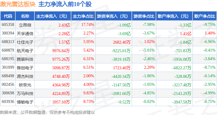 从资金流向上来看,当日激光雷达板块主力资金净流出36.47亿元,游资资金净流入11.93亿元,散户资金净流入24.54亿元。激光雷达板块个股资金流向见下表: