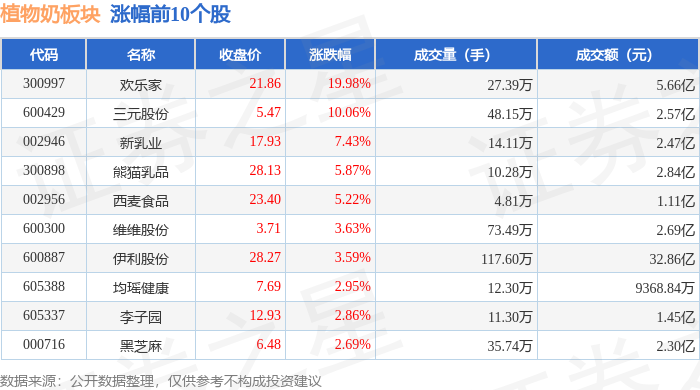 证券之星消息,11月10日植物奶板块较上一交易日上涨3.99%,欢乐家领涨。当日上证指数报收于4018.6,上涨0.53%。深证成指报收于13427.61,上涨0.18%。植物奶板块个股涨跌见下表: