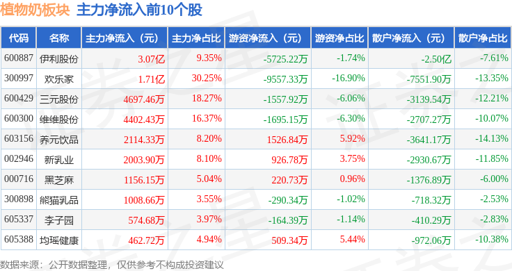 从资金流向上来看,当日植物奶板块主力资金净流入5.87亿元,游资资金净流出1.58亿元,散户资金净流出4.29亿元。植物奶板块个股资金流向见下表: