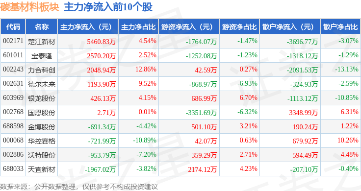 从资金流向上来看,当日碳基材料板块主力资金净流出9454.65万元,游资资金净流出5646.59万元,散户资金净流入1.51亿元。碳基材料板块个股资金流向见下表: