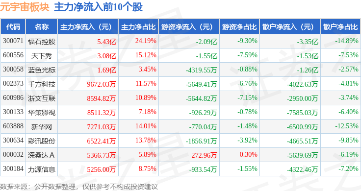 从资金流向上来看,当日元宇宙板块主力资金净流出13.34亿元,游资资金净流入3.23亿元,散户资金净流入10.11亿元。元宇宙板块个股资金流向见下表: