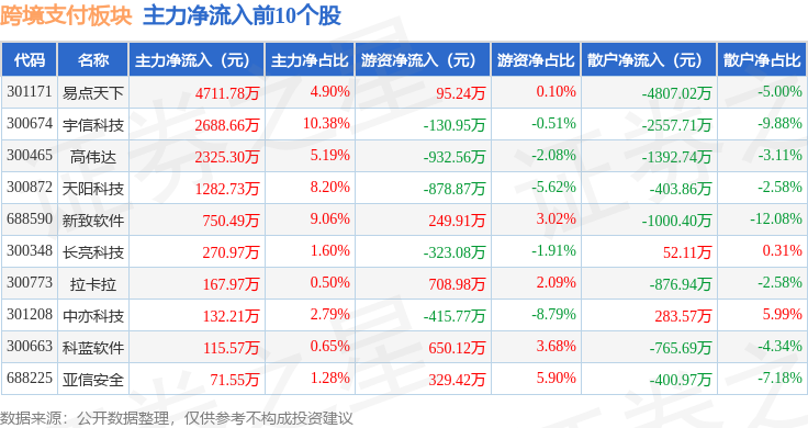 从资金流向上来看,当日跨境支付板块主力资金净流出10.59亿元,游资资金净流入9382.02万元,散户资金净流入9.65亿元。跨境支付板块个股资金流向见下表:
