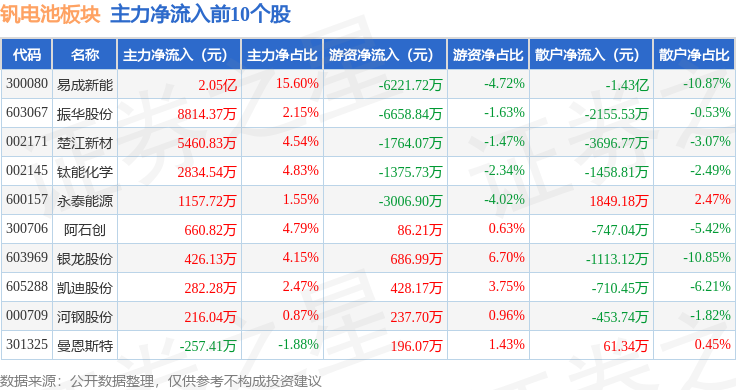 从资金流向上来看,当日钒电池板块主力资金净流出3.48亿元,游资资金净流出5017.64万元,散户资金净流入3.98亿元。钒电池板块个股资金流向见下表: