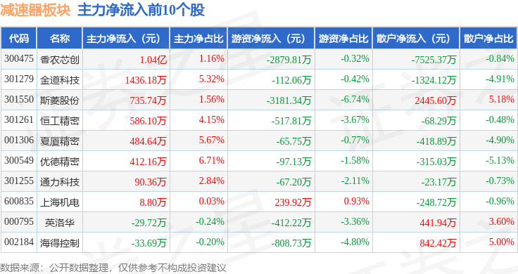 从资金流向上来看,当日减速器板块主力资金净流出13.45亿元,游资资金净流入1.83亿元,散户资金净流入11.62亿元。减速器板块个股资金流向见下表: