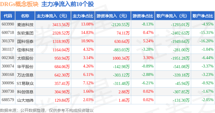 从资金流向上来看,当日DRGs概念板块主力资金净流出3022.32万元,游资资金净流出3255.67万元,散户资金净流入6277.99万元。DRGs概念板块个股资金流向见下表: