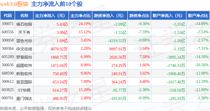 从资金流向上来看,当日web3.0板块主力资金净流入6.95亿元,游资资金净流出2.64亿元,散户资金净流出4.31亿元。web3.0板块个股资金流向见下表: