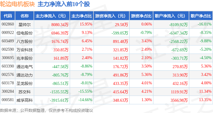 从资金流向上来看,当日轮边电机板块主力资金净流出14.39亿元,游资资金净流入2.51亿元,散户资金净流入11.88亿元。轮边电机板块个股资金流向见下表: