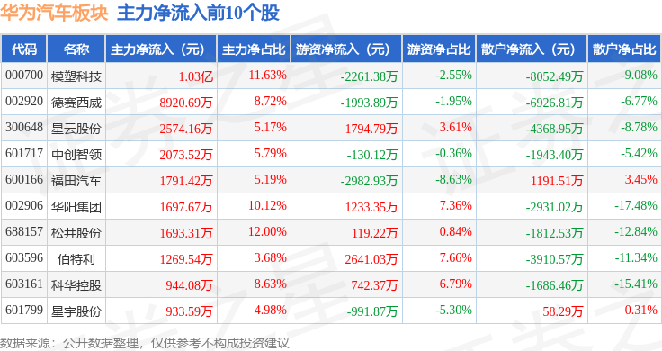 从资金流向上来看,当日华为汽车板块主力资金净流出35.74亿元,游资资金净流入4.06亿元,散户资金净流入31.68亿元。华为汽车板块个股资金流向见下表: