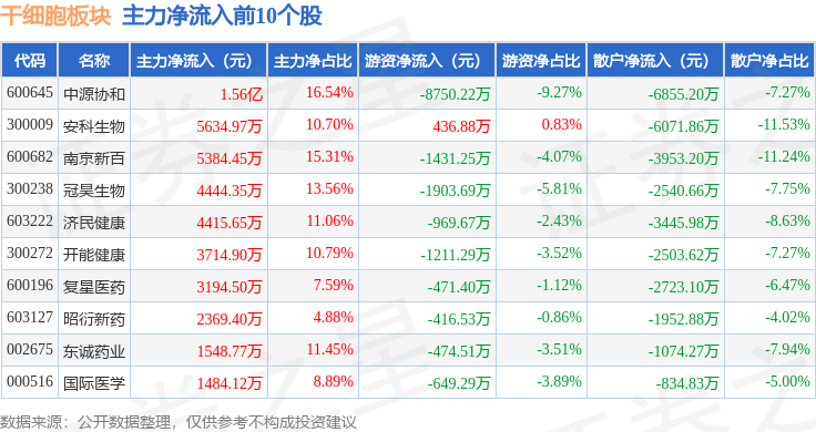 从资金流向上来看,当日干细胞板块主力资金净流入3.28亿元,游资资金净流出1.65亿元,散户资金净流出1.64亿元。干细胞板块个股资金流向见下表: