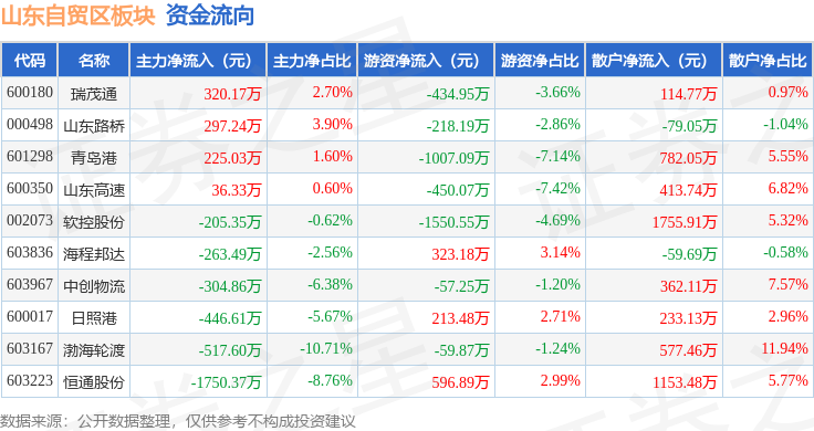从资金流向上来看,当日山东自贸区板块主力资金净流出2609.51万元,游资资金净流出2644.41万元,散户资金净流入5253.92万元。山东自贸区板块个股资金流向见下表: