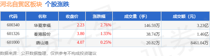 证券之星消息,11月10日河北自贸区板块较上一交易日上涨1.05%,华夏幸福领涨。当日上证指数报收于4018.6,上涨0.53%。深证成指报收于13427.61,上涨0.18%。河北自贸区板块个股涨跌见下表: