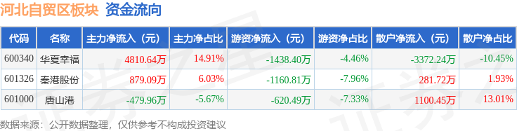 从资金流向上来看,当日河北自贸区板块主力资金净流入5209.77万元,游资资金净流出3219.7万元,散户资金净流出1990.07万元。河北自贸区板块个股资金流向见下表: