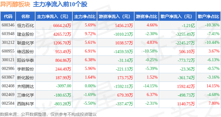 从资金流向上来看,当日异丙醇板块主力资金净流入4644.65万元,游资资金净流入1761.82万元,散户资金净流出6406.47万元。异丙醇板块个股资金流向见下表: