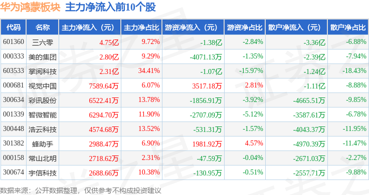 从资金流向上来看,当日华为鸿蒙板块主力资金净流入1.72亿元,游资资金净流出9816.77万元,散户资金净流出7427.96万元。华为鸿蒙板块个股资金流向见下表: